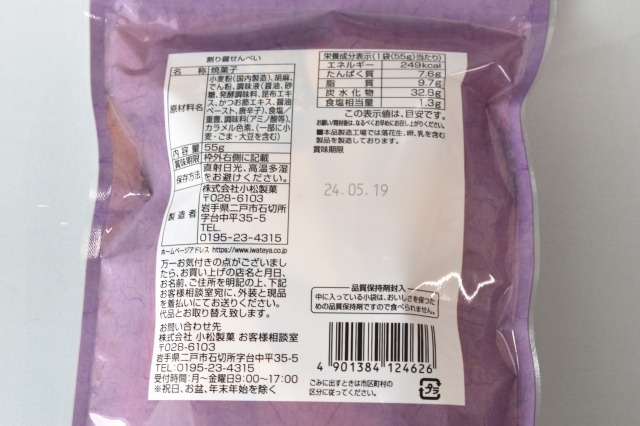小麦粉(国内製造)、胡麻、でん粉、調味液(醤油、砂糖、発酵調味料、昆布エキス、かつお節エキス、醤油ペースト、唐辛子)、食塩/重曹、調味料(アミノ酸等)、カラメル色素、(一部に小麦・ごま・大豆を含む)